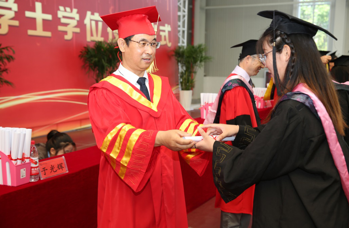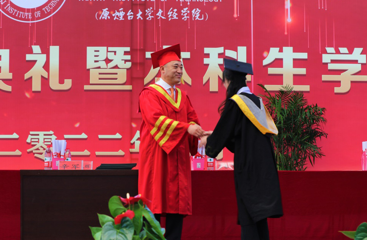 大會(huì)最后,辛軍董事長(zhǎng)、煙臺(tái)理工學(xué)院校領(lǐng)導(dǎo)及導(dǎo)師為獲得學(xué)士學(xué)位的畢業(yè)生頒發(fā)證書(shū),扶正流蘇并合影留念。